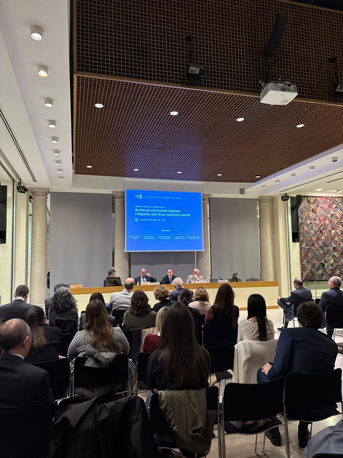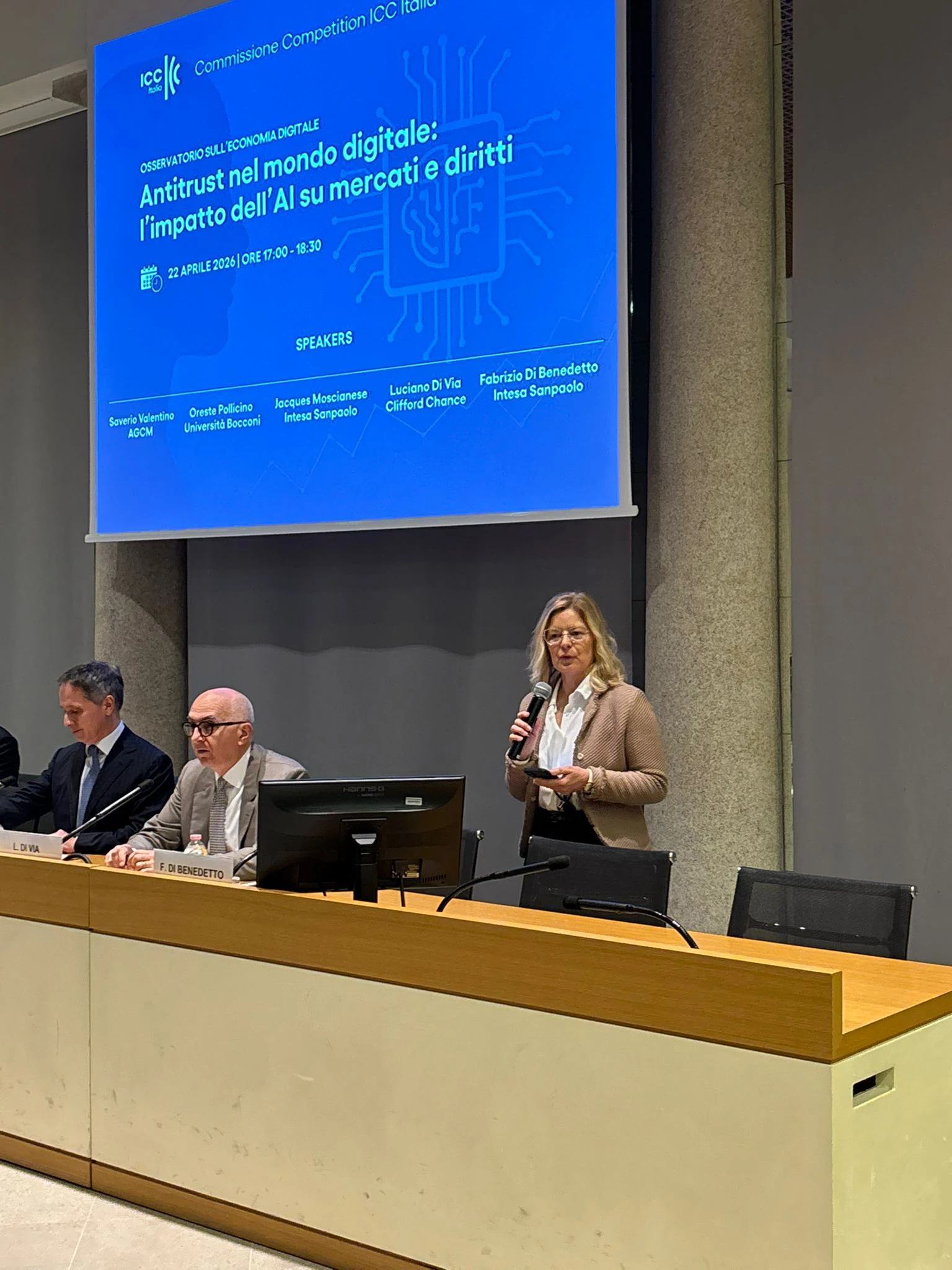 L’iniziativa ha messo a confronto rappresentanti delle istituzioni, del mondo accademico, delle imprese e della professione legale sulle nuove sfide poste dall’intelligenza artificiale e dalla crescente concentrazione di potere nei mercati digitali. Tra i relatori figuravano Saverio Valentino, Componente del Collegio dell’Autorità Garante della Concorrenza e del Mercato; Oreste Pollicino, Professore ordinario di Diritto costituzionale e AI Regulation presso l’Università Bocconi; Jacques Moscianese, Executive Director, Group Head of Institutional Affairs di Intesa Sanpaolo e componente del Consiglio Direttivo di ICC Italia; Luciano Di Via, Chair della Commissione Competition ICC Italia e Head of the Italian Antitrust Practice di Clifford Chance; Fabrizio Di Benedetto, Co-Chair della Commissione Competition ICC Italia e COA Expert, Antitrust Affairs, Direzione Centrale Institutional Affairs di Intesa Sanpaolo.